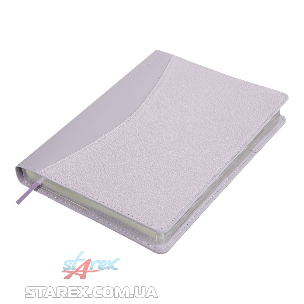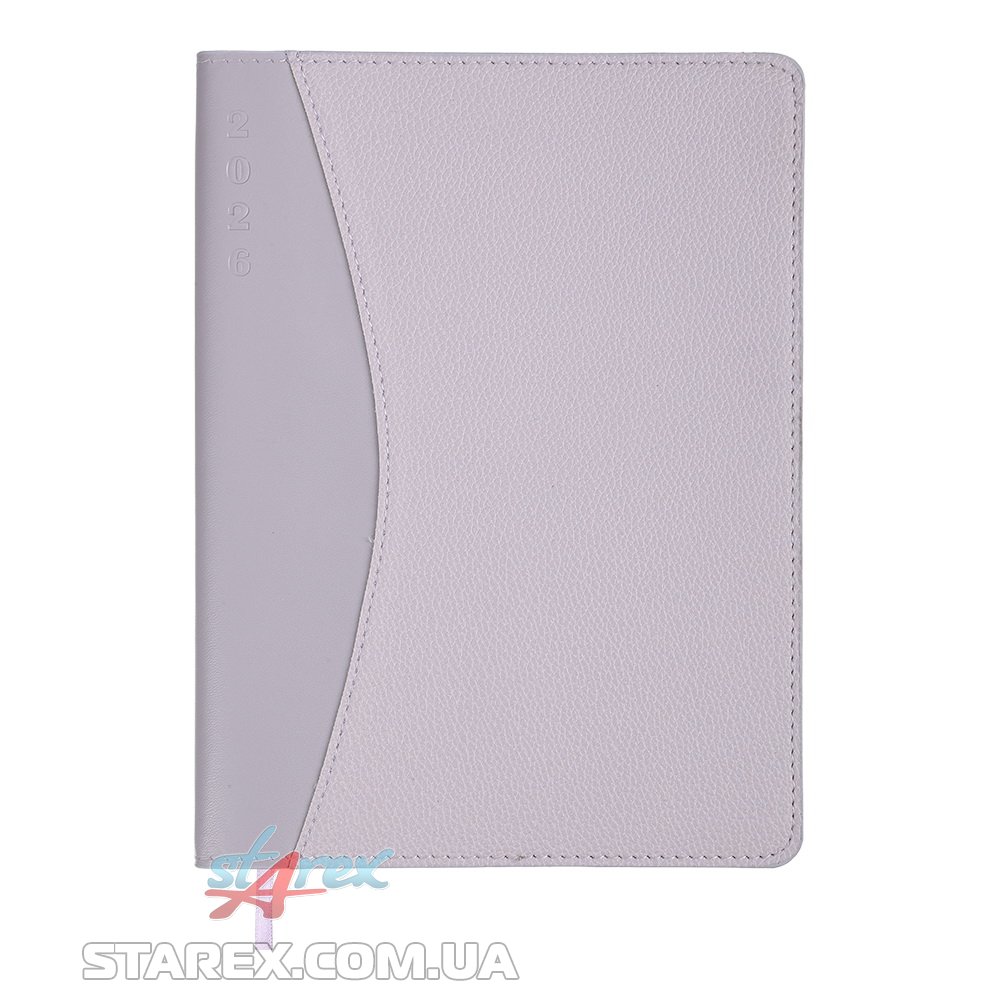 Гнучка знімна обкладинка-органайзер з штучної шкіри щоденника AURORA виконана в ніжному пастельному дизайні, що поєднує матеріал з фактурної шкіри та вставку на корінці з гладкої шкіри. Елементи оздоблення - сліпе тиснення року та декоративний шов по периметру і на стику фактур. Родзинкою дизайну є тонування сріблом зрізу внутрішнього блоку. З середини обкладинка має по кишені для візиток, нотаток тощо на передній та задній стороні, а також петельку для закріплення письмового приладдя