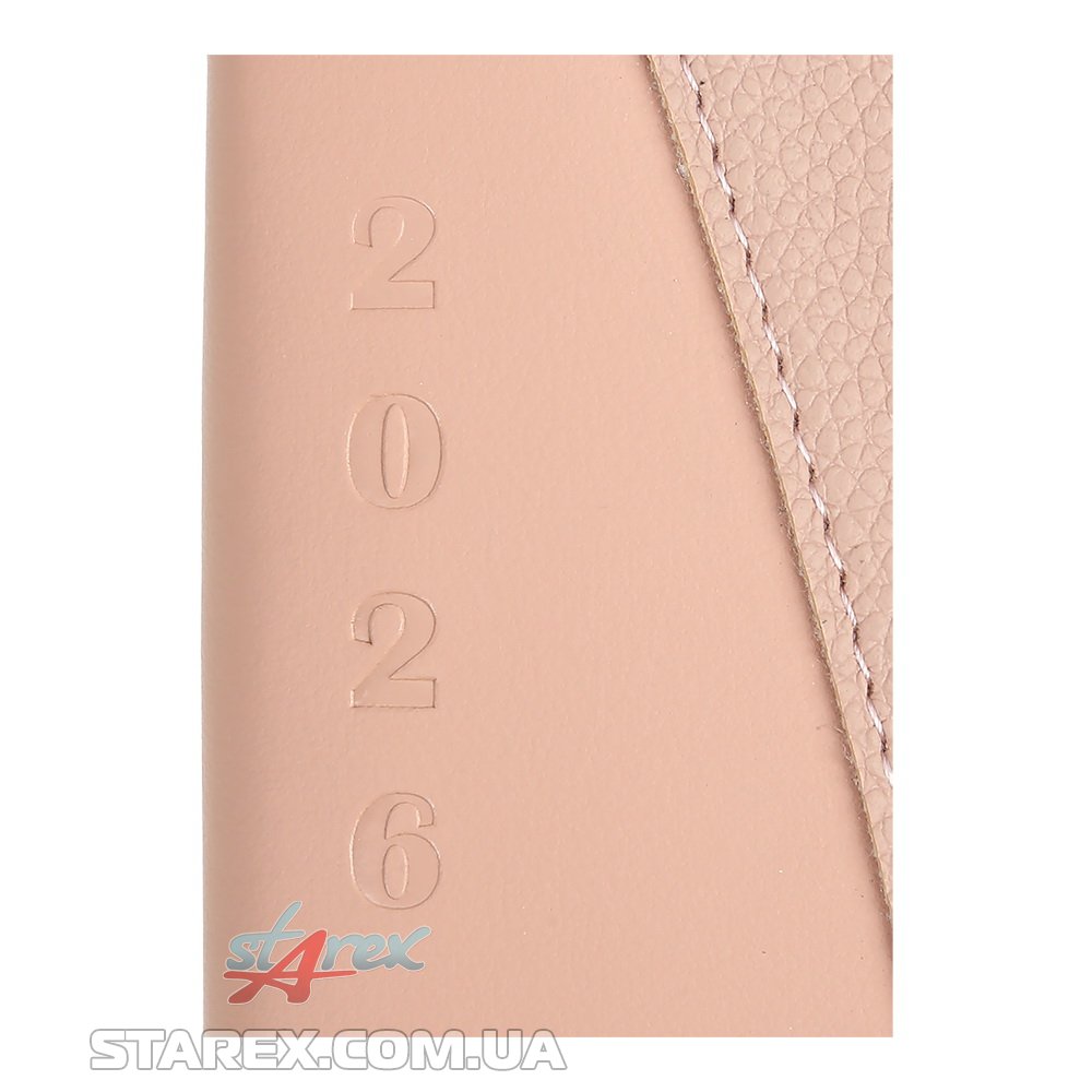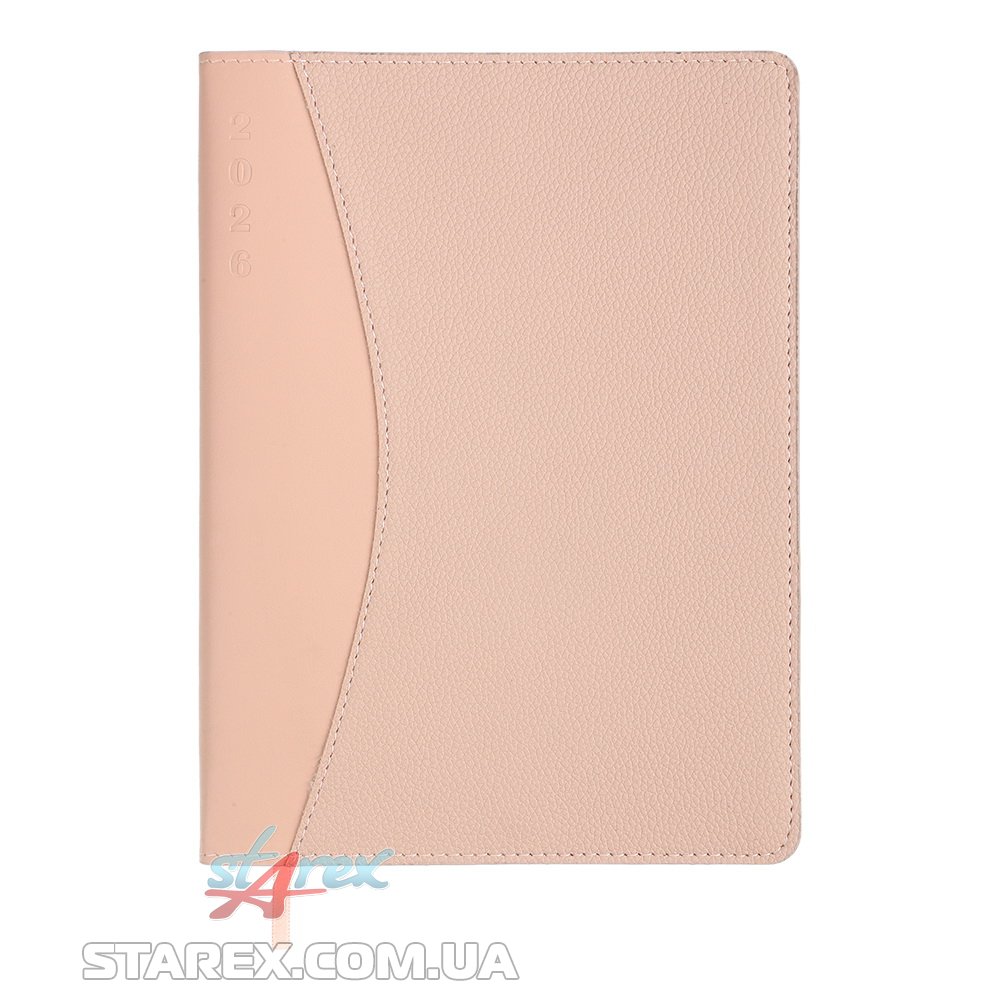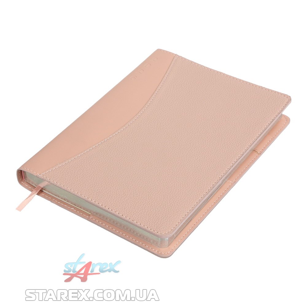 Гнучка знімна обкладинка-органайзер з штучної шкіри щоденника AURORA виконана в ніжному пастельному дизайні, що поєднує матеріал з фактурної шкіри та вставку на корінці з гладкої шкіри. Елементи оздоблення - сліпе тиснення року та декоративний шов по периметру і на стику фактур. Родзинкою дизайну є тонування сріблом зрізу внутрішнього блоку. З середини обкладинка має по кишені для візиток, нотаток тощо на передній та задній стороні, а також петельку для закріплення письмового приладдя
