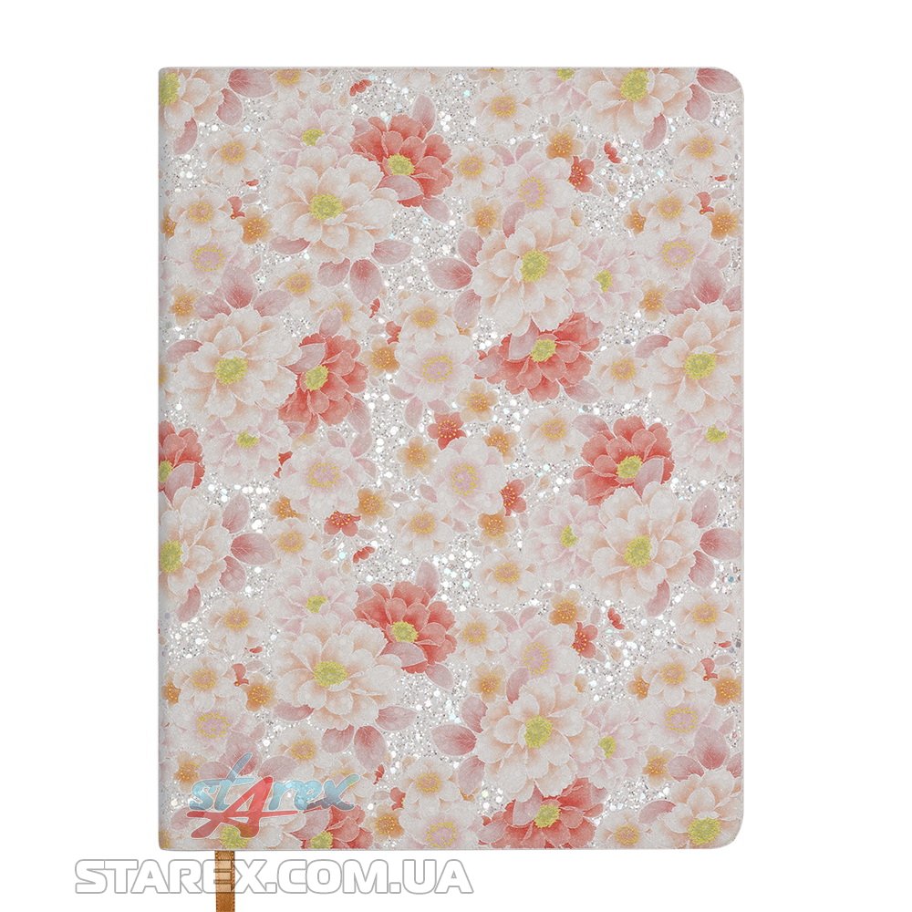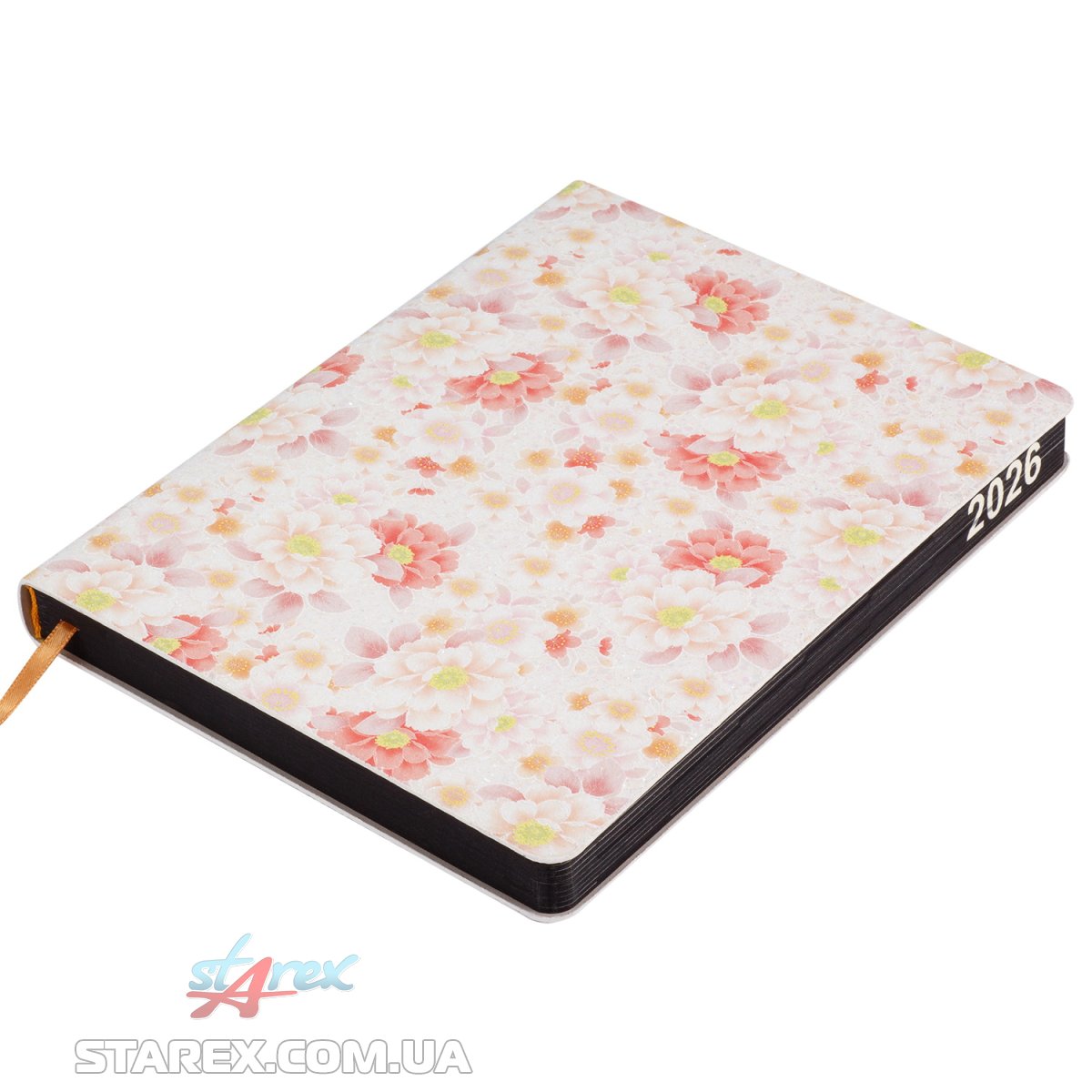 Гнучка обкладинка зі штучної шкіри щоденника BLOOM має стильний та привабливий дизайнерський візерунок та фактурну поверхню з блискітками. Гармонійно доповнює дизайн тонований в чорний колір зріз внутрішнього блоку та нанесення року на ньому