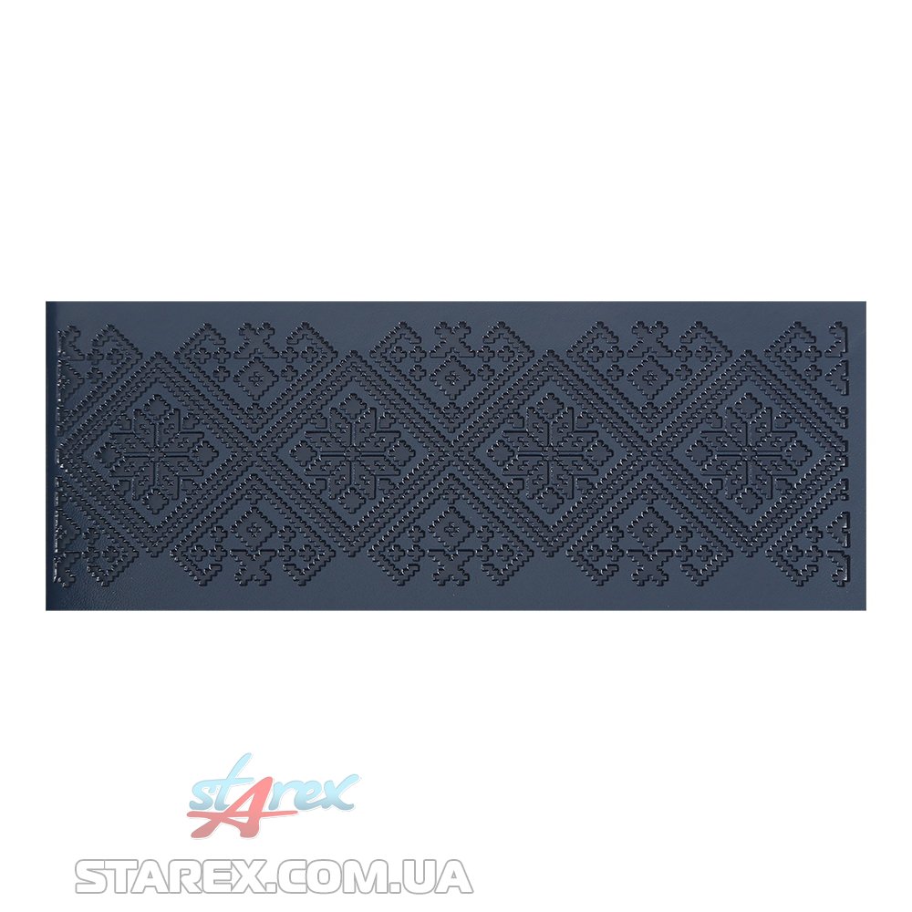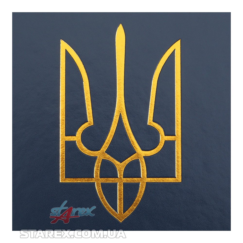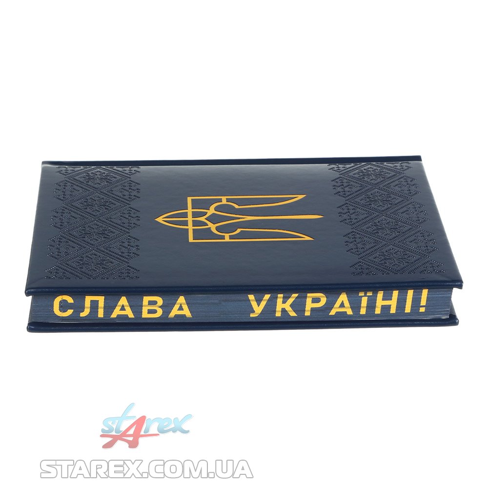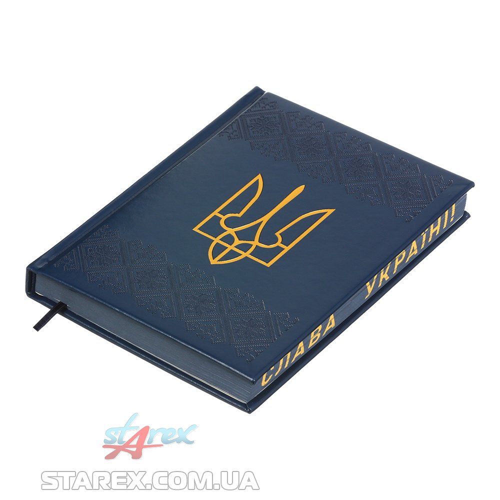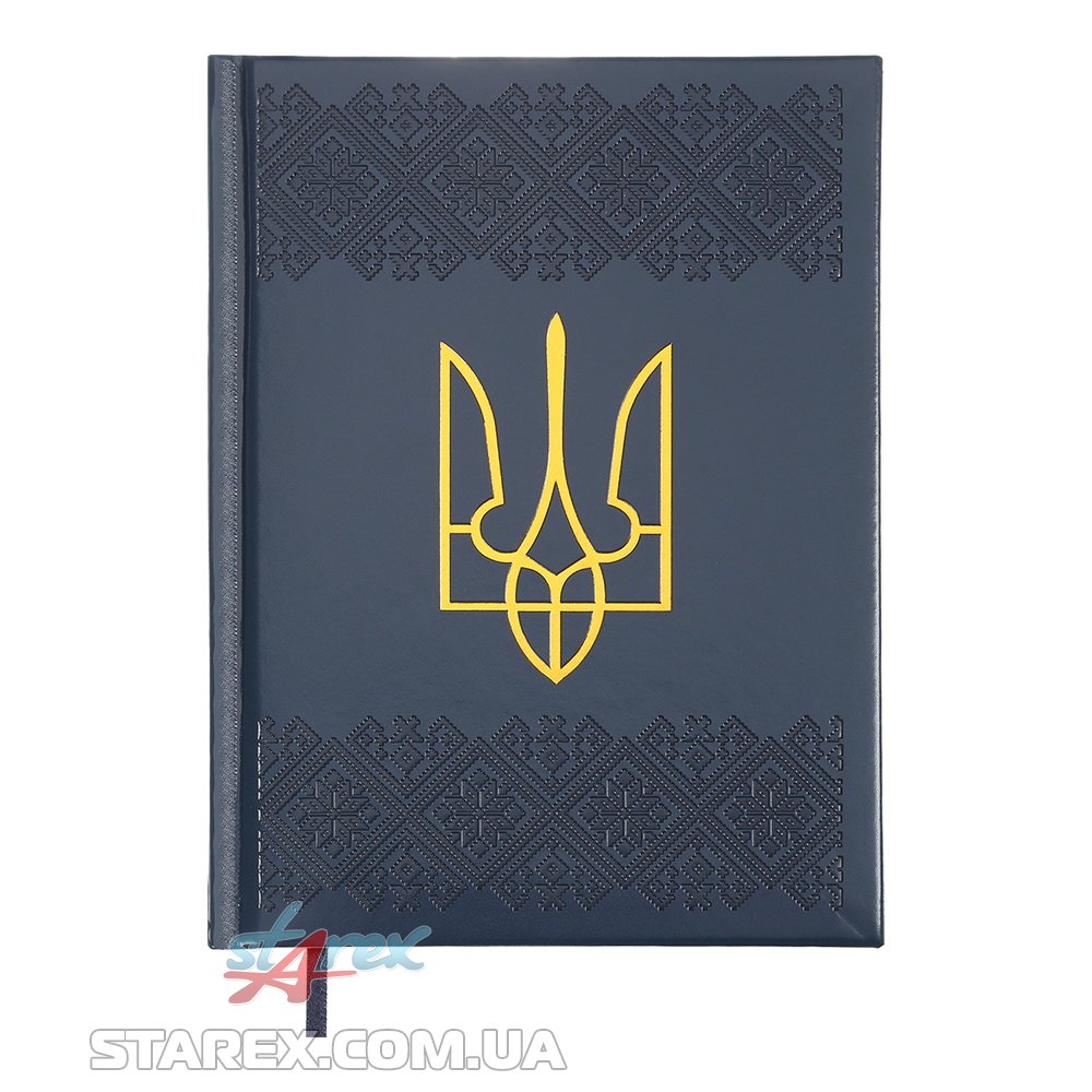 Жорстка обкладинка з гладкої штучної шкіри з поролоном щоденника HERALDRY виконана в патріотичному стилі: має оздоблення українським орнаментом, виконаним сліпим тисненням та тиснення Герба України золотою фольгою. Гармонійно доповнює дизайн щоденника тонований в колір обкладинки зріз внутрішнього блоку з написом СЛАВА УКРАЇНІ та тиснення року на корінці.