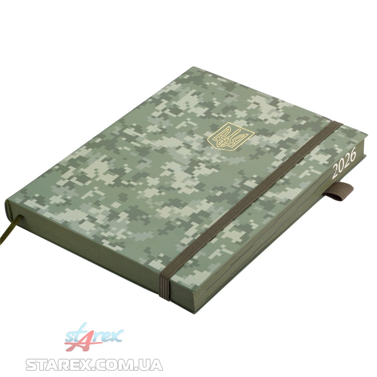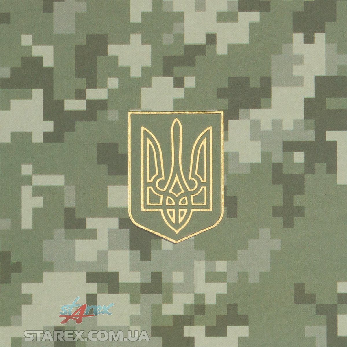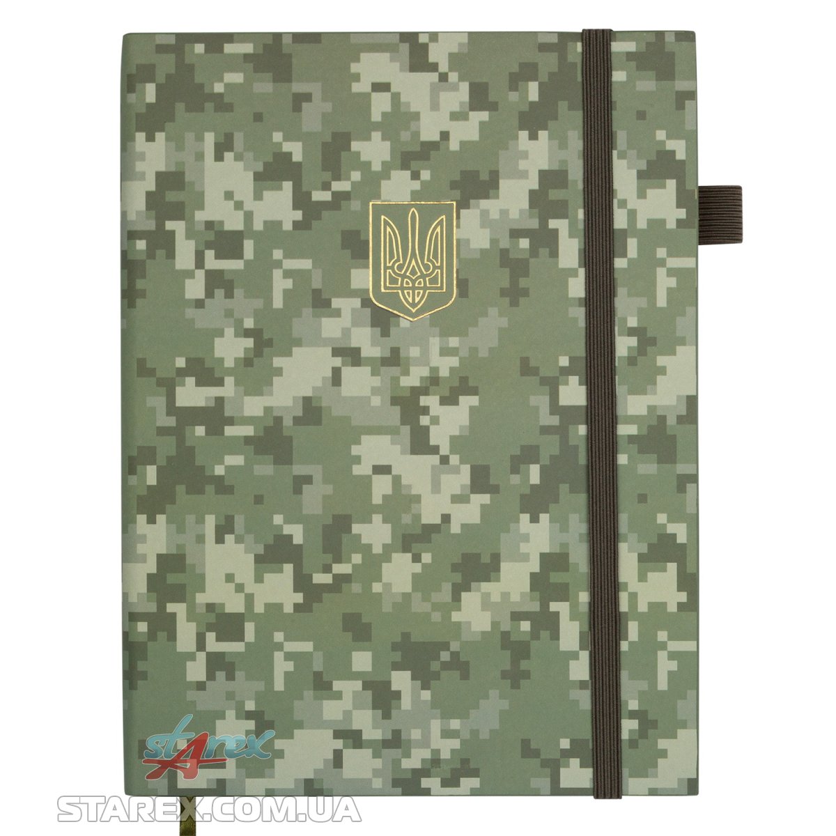 Гнучка обкладинка зі штучної шкіри з покриттям soft touch щоденника MILITARY виконана в мужньому армійському стилі із зображенням військового шеврону тисненого золотою фольгою. Функціональності щоденнику додають поздовжня гумка, що надійно фіксує щоденник в закритому стані, та петля для ручки. Гармонійно доповнює дизайн тонований в колір обкладинки зріз внутрішнього блоку.