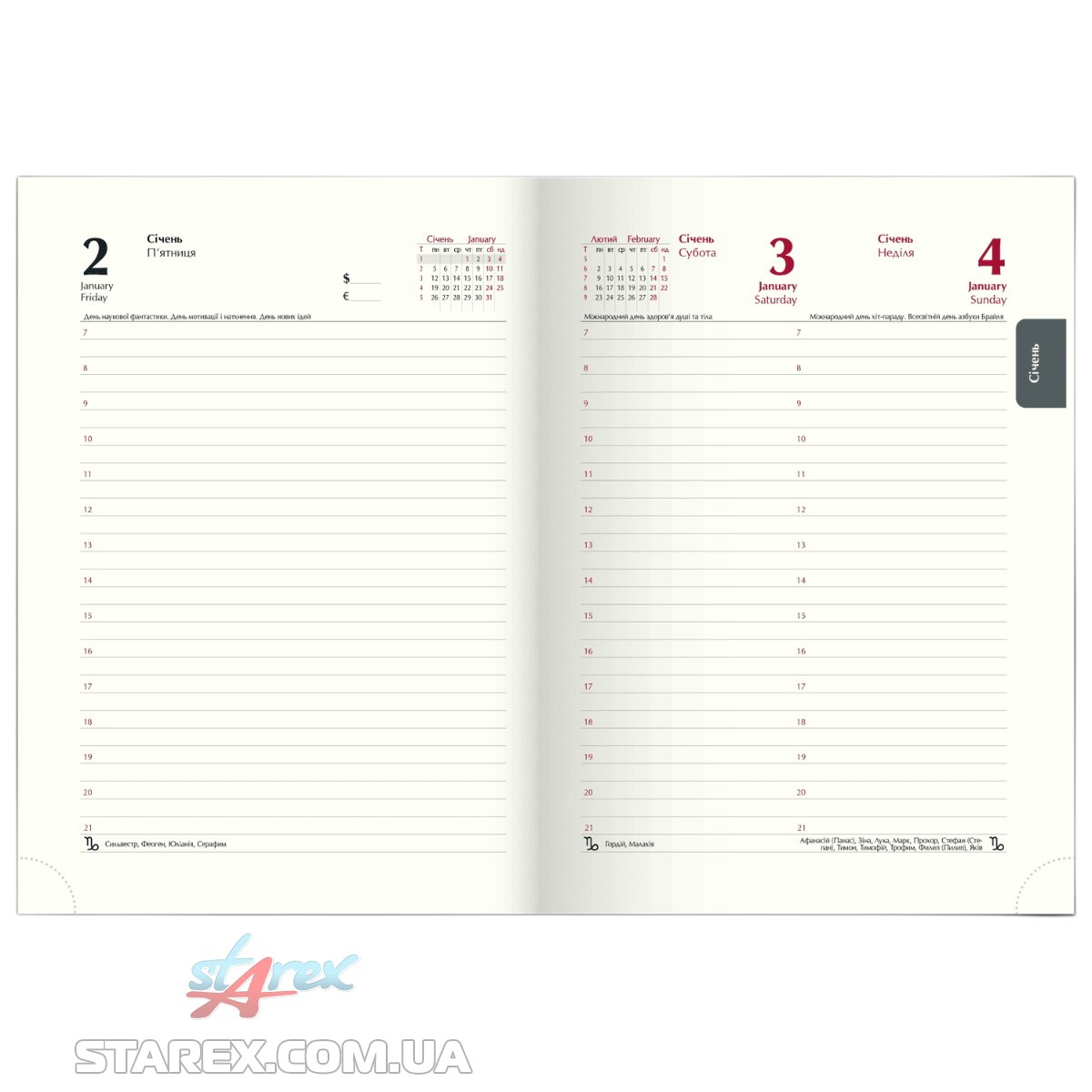 - Датована сторінка на кожен день року з організатором часу від 7:00 до 21:00, календарем на поточний/наступний місяць, позначенням дня тижня, знаку зодіаку, іменинників