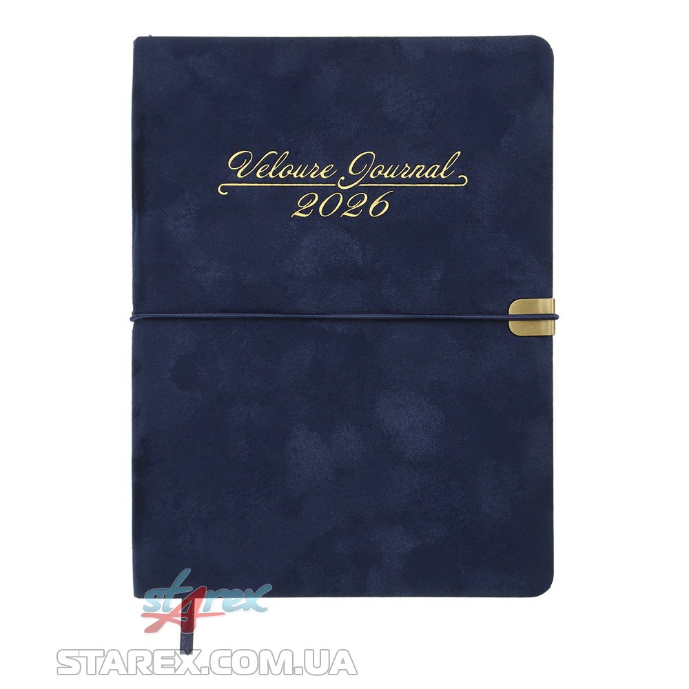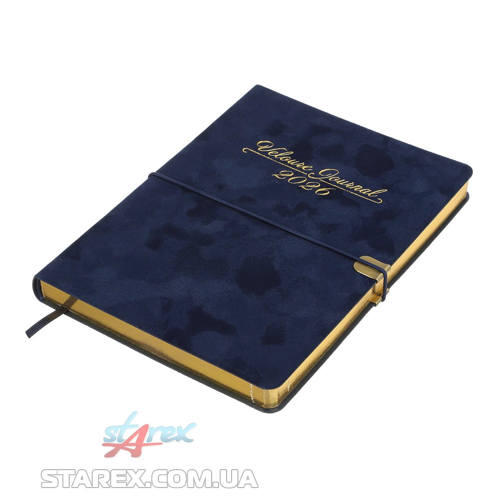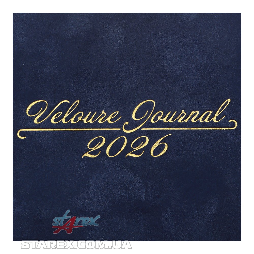 Гнучка обкладинка щоденника VELOUR виконана з штучної шкіри з виразним оксамитовим покриттям. Дві функціональні шильди на лицьовій та зворотній стороні обкладинки з поглибленнями для поперечної гумки забезпечують зручну та надійну фіксацію щоденника в закритому стані. Дизайн гармонійно доповнює та збагачує тонований золотим кольором зріз внутрішнього блоку та тиснення золотою фольгою року і напису на лицьовій стороні обкладинки