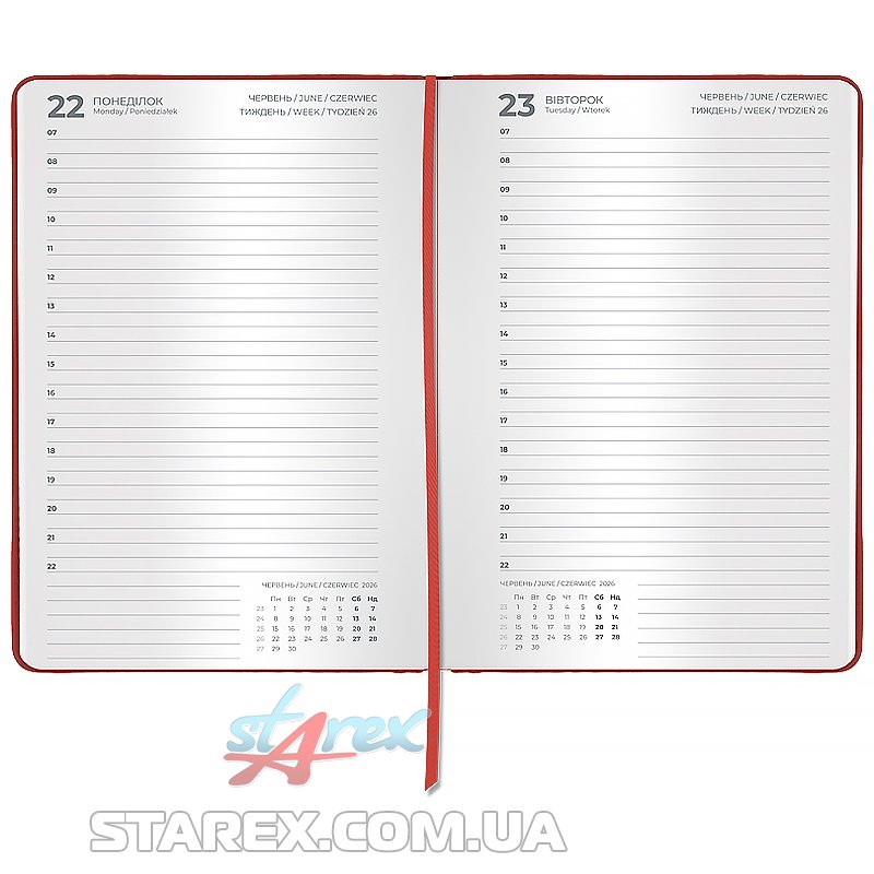 - Щоденник містить календар на 2026-2027 рік, загальний тижневий розклад, інформацію про свята, важливі номери телефонів, часові пояси країн світу, одиниці вимірювання, шкалу температур