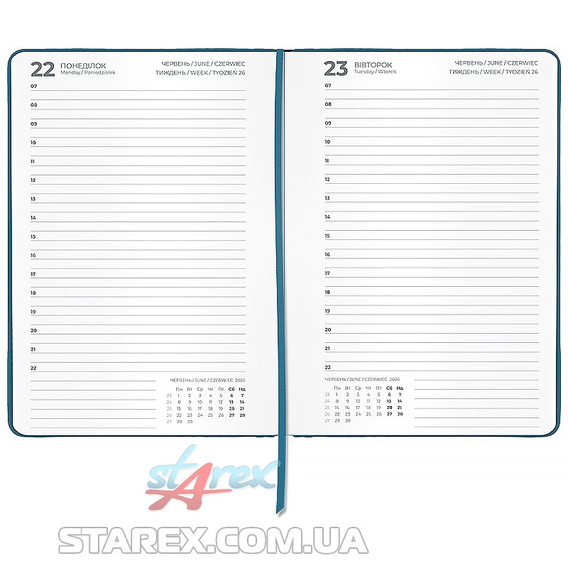 - Щоденник містить календар на 2026-2027 рік, загальний тижневий розклад, інформацію про свята, важливі номери телефонів, часові пояси країн світу, одиниці вимірювання, шкалу температур