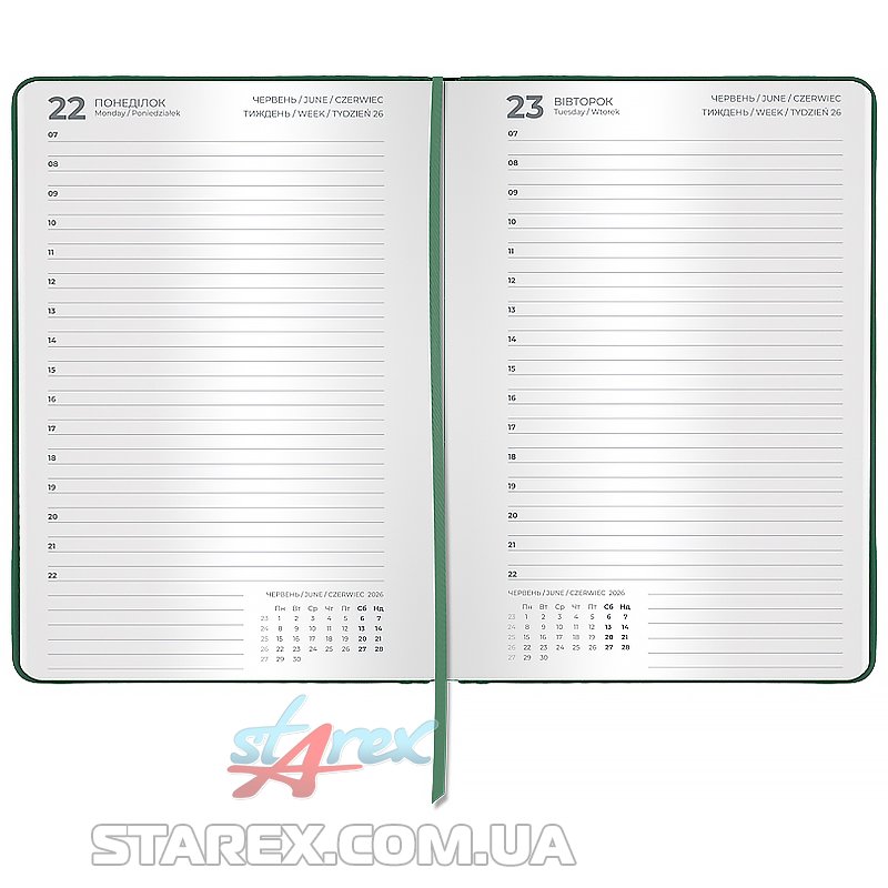 - Щоденник містить календар на 2026-2027 рік, загальний тижневий розклад, інформацію про свята, важливі номери телефонів, часові пояси країн світу, одиниці вимірювання, шкалу температур