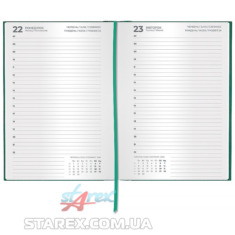 - Щоденник містить календар на 2026-2027 рік, загальний тижневий розклад, інформацію про свята, важливі номери телефонів, часові пояси країн світу, одиниці вимірювання, шкалу температур