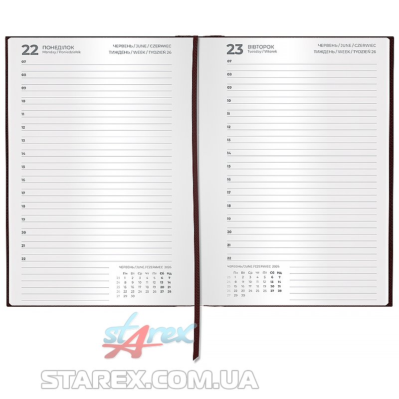 - Щоденник містить календар на 2026-2027 рік, загальний тижневий розклад, інформацію про свята, важливі номери телефонів, часові пояси країн світу, одиниці вимірювання, шкалу температур