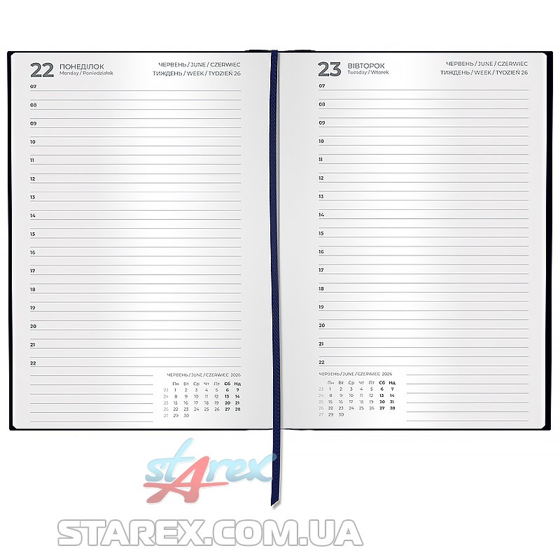 - Щоденник містить календар на 2026-2027 рік, загальний тижневий розклад, інформацію про свята, важливі номери телефонів, часові пояси країн світу, одиниці вимірювання, шкалу температур