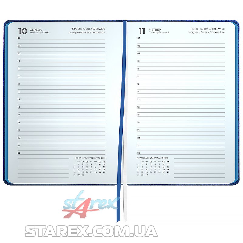 - Щоденник містить календар на 2026-2027 рік, загальний тижневий розклад, інформацію про свята, важливі номери телефонів, часові пояси країн світу, одиниці вимірювання, шкалу температур
