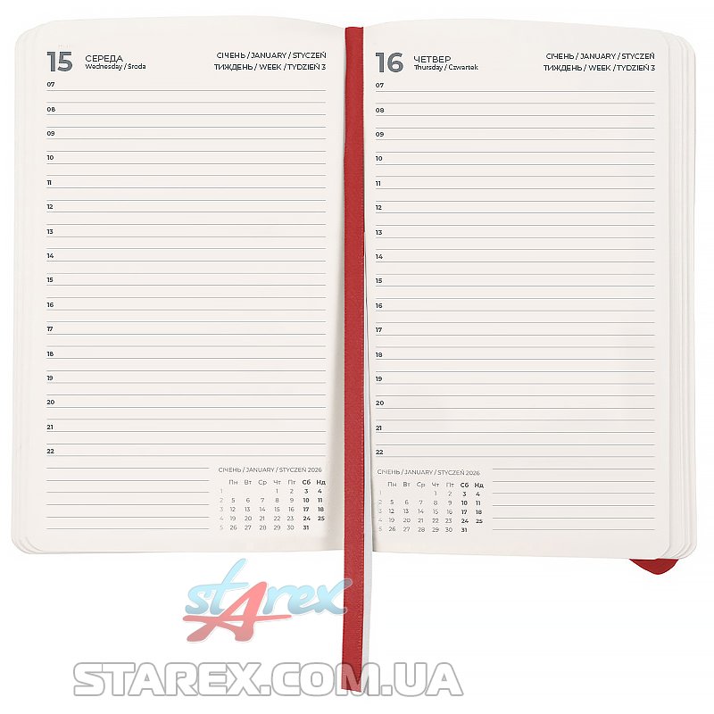 - Щоденник містить календар на 2026-2027 рік, загальний тижневий розклад, інформацію про свята, важливі номери телефонів, часові пояси країн світу, одиниці вимірювання, шкалу температур