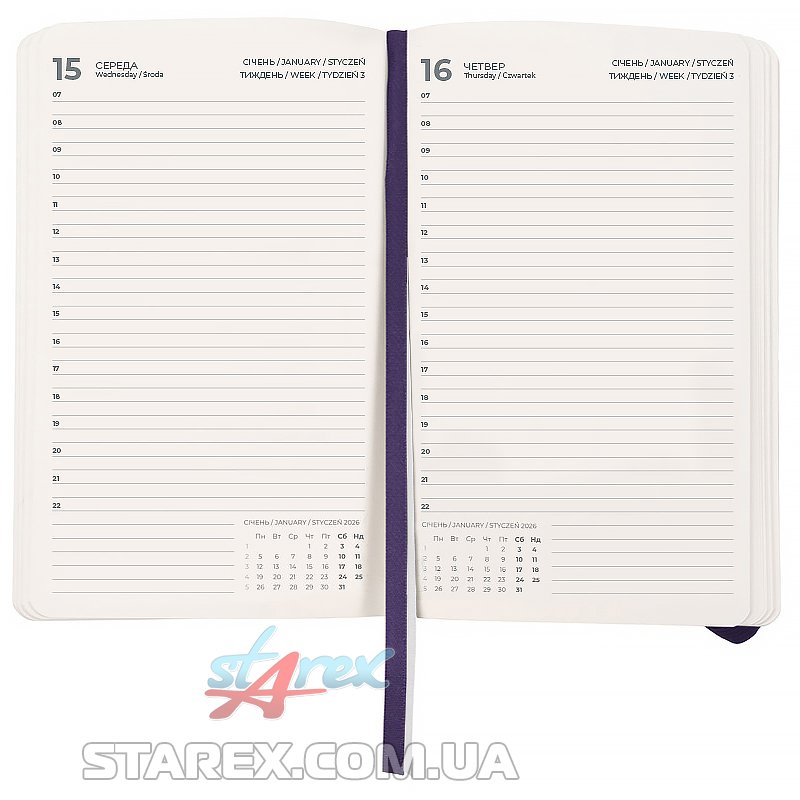 - Щоденник містить календар на 2026-2027 рік, загальний тижневий розклад, інформацію про свята, важливі номери телефонів, часові пояси країн світу, одиниці вимірювання, шкалу температур