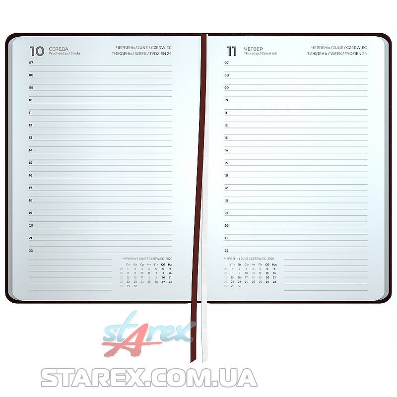 - Щоденник містить календар на 2026-2027 рік, загальний тижневий розклад, інформацію про свята, важливі номери телефонів, часові пояси країн світу, одиниці вимірювання, шкалу температур