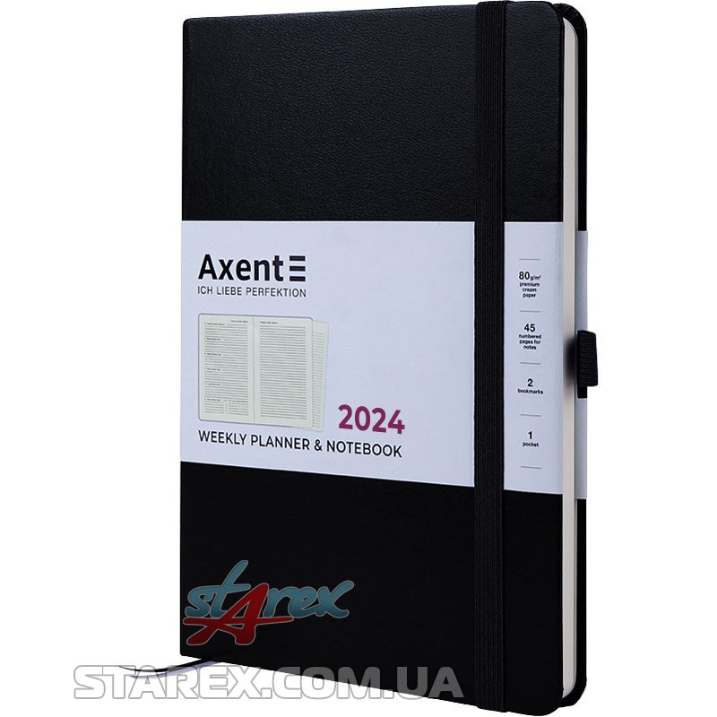 Щотижневик Axent на 2024 рік формату А5 із серії Prime Strong з твердою обкладинкою. Використовується для щоденних записів, а також ділових та творчих задач. Тверда обкладинка з вінілу допомагає зберегти акуратний та презентабельний вигляд протягом довгого часу. Якісний кремовий папір щільністю 80г/м2 добре вбирає чорнило та забезпечує комфортне письмо. Зручно робити записи, креслити та малювати. Щотижневик поділений на 2 частини – датований блок у лінію для зручного планування справ і додаткові сторінки у клітинку для ведення особистих записів. Внутрішній блок українською мовою. Щотижневик містить календар на 2024-2025 рік, загальний тижневий розклад, поля для запису улюблених книг, трекер корисних звичок, інформацію про свята, важливі номери телефонів, часові пояси країн світу, одиниці вимірювання, шкалу температур. Дві різнокольорові закладки-ляссе дозволяють швидко знайти та відкрити потрібні сторінки. Кишеня на форзаці надійно зберігає нотатки, чеки, картки та інші важливі дрібниці. Еластична тасьма запобігає самовільному відкриванню. Містить 96 аркушів, розмір - 145х210мм