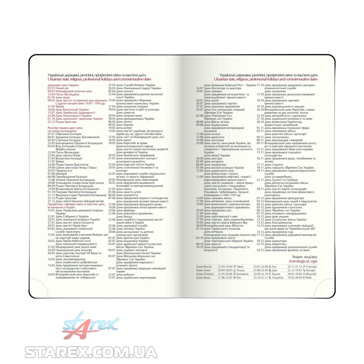 - Інформаційно-довідковий блок: національні, релігійні, професійні свята та пам'ятні дати, знаки зодіаку, телефонні коди мобільних операторів та обласних центрів України, літерні автомобільні коди країн, таблиця відстаней між обласними центрами України, довідник систем вимірювання, міжнародні знаки відповідності, знаки догляду за одягом