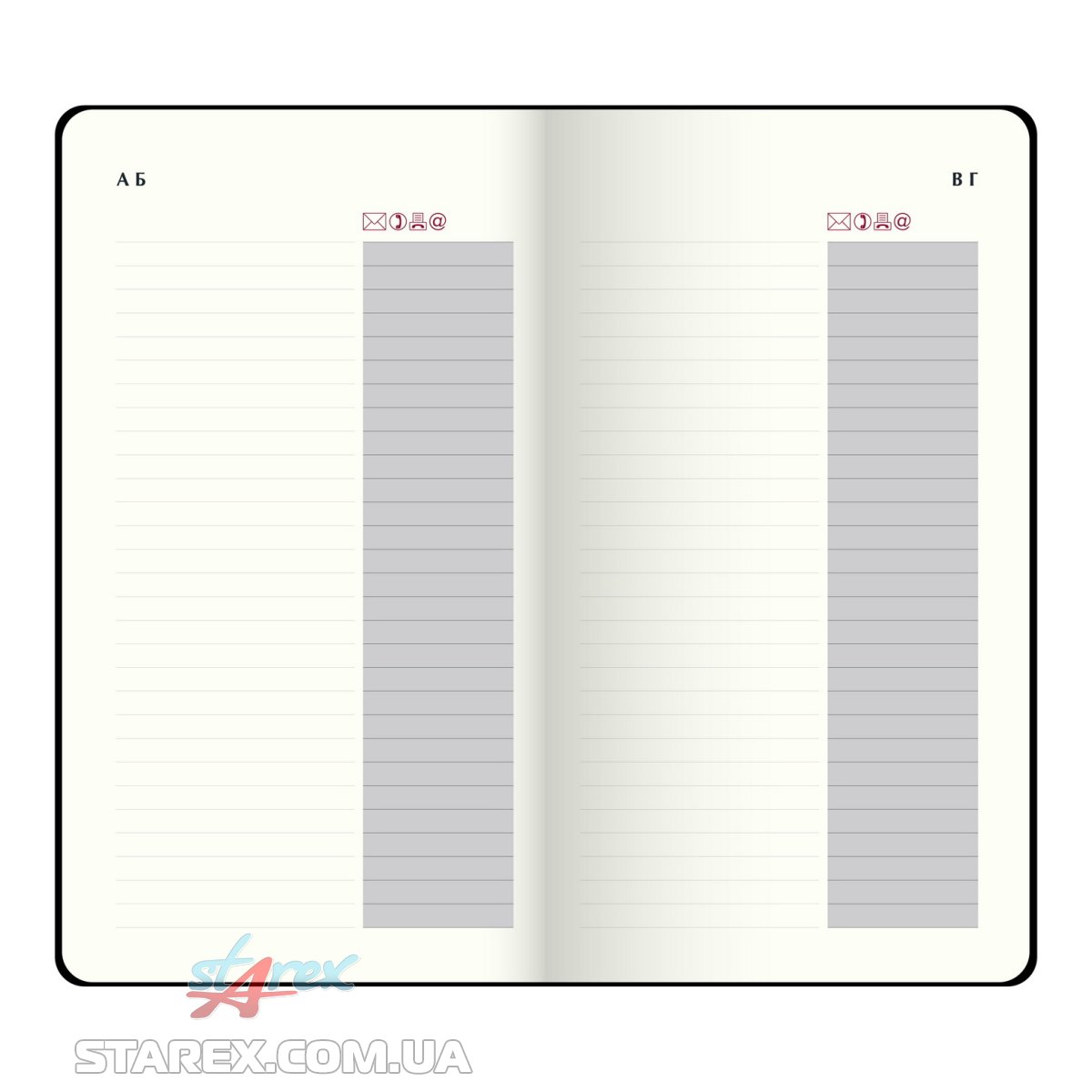 Гнучка обкладинка щотижневика SALERNO виконана з гладкої штучної шкіри. Унікальним елементом дизайну є металевий декор - шильда на лицьовій стороні обкладинки. Гармонійно доповнює дизайн сліпе тиснення року на корінці, тонований зріз внутрішнього блоку в колір обкладинки та тонований в колір обкладинки зріз внутрішнього блоку. Кишеньковий розмір щотижневика робить його постійним супутником свого власника, він не займе багато місця навіть у маленькій сумці і завжди буде під рукою.