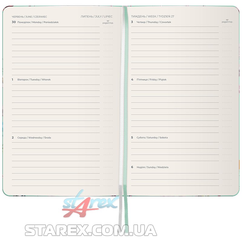 Тверда обкладинка з вінілу допомагає зберегти акуратний та презентабельний вигляд протягом довгого часу. Якісний кремовий папір щільністю 80г/м2 добре вбирає чорнило та забезпечує комфортне письмо. Зручно робити записи, креслити та малювати. Щотижневик поділений на 2 частини – датований блок у лінію для зручного планування справ і додаткові сторінки у клітинку для ведення особистих записів.
