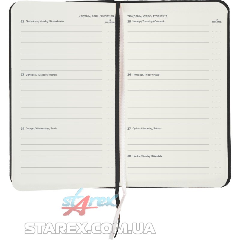 Тверда обкладинка з вінілу допомагає зберегти акуратний та презентабельний вигляд протягом довгого часу. Якісний кремовий папір щільністю 80г/м2 добре вбирає чорнило та забезпечує комфортне письмо. Зручно робити записи, креслити та малювати. Щотижневик поділений на 2 частини – датований блок у лінію для зручного планування справ і додаткові сторінки у клітинку для ведення особистих записів.
