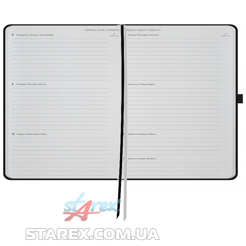- Щотижневик поділений на 2 частини – датований блок у лінію для зручного планування справ і додаткові сторінки у клітинку для ведення особистих записів
