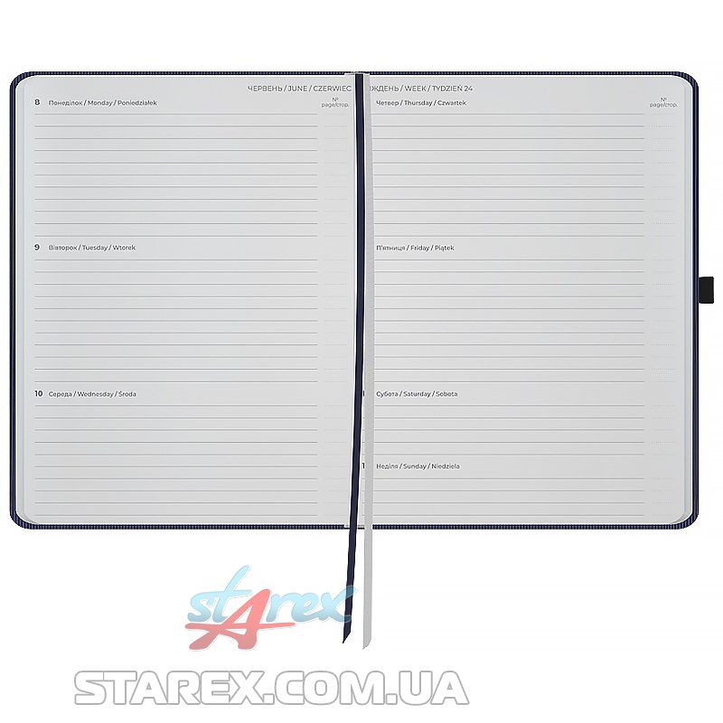 - Щотижневик поділений на 2 частини – датований блок у лінію для зручного планування справ і додаткові сторінки у клітинку для ведення особистих записів