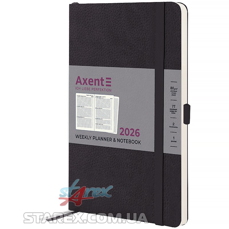 Щотижневик Axent із серії Soft Skin в м'якій, еластичній обкладинці з текстурою під шкіру. Використовується для щоденних записів, а також ділових та творчих задач.