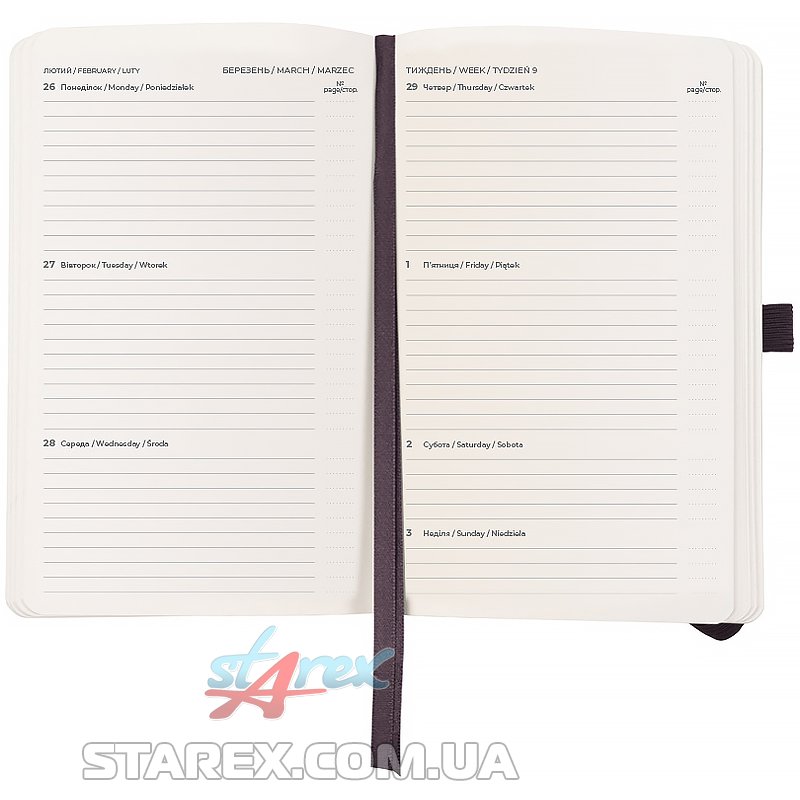 - Щотижневик поділений на 2 частини – датований блок у лінію для зручного планування справ і додаткові сторінки у клітинку для ведення особистих записів