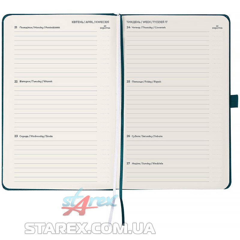 - Щотижневик поділений на 2 частини – датований блок у лінію для зручного планування справ і додаткові сторінки у клітинку для ведення особистих записів