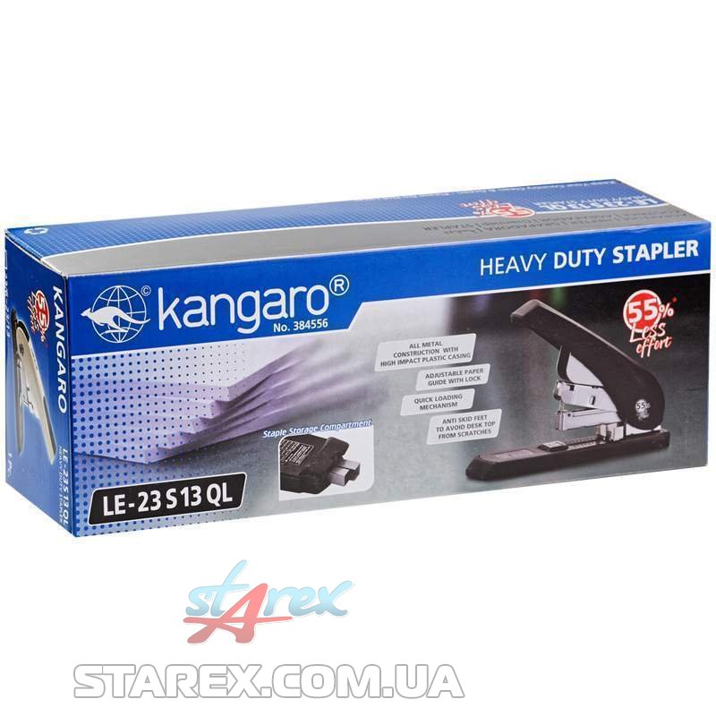 Потужний степлер Kangaro LE-23S13-QL виконаний з високоякісного пластику та металу. Прогумована ручка гарантує комфортне використання. Є спеціальний відсік для зберігання скоб. Пластикова основа степлера не дряпає поверхню стола й запобігає ковзанню. Інноваційна техніка Less Effort при використанні важеля економить до 55% зусиль, що додаються. Наявність системи блокування у закритому вигляді дозволяє економити робочий простір