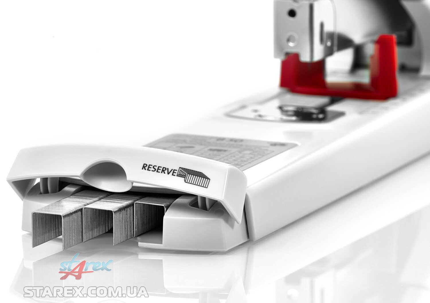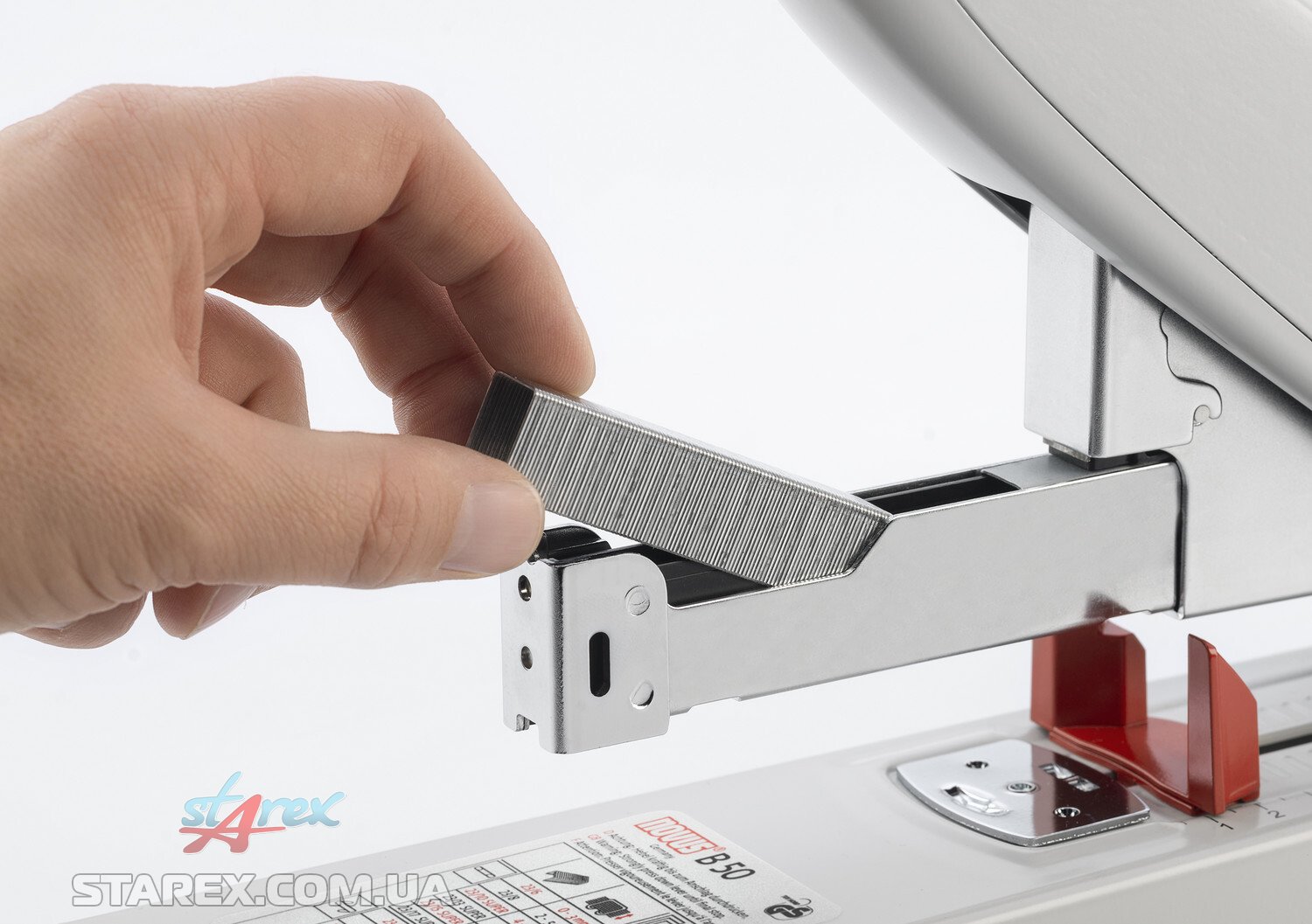 Антиблокувальна система (ABS) для зручного та бездоганного зшивання. Автоматичний завантажувальний механізм з подвійною пружинної направляючої скоб. Регульована глибина закладки листів (до 75мм). Швидке видалення застряглих скоб шляхом "холостого зшивання". Реверсивна матриця для простого переходу з режиму паралельного в режим BY PASS зшивання. Вага: близько 1460 г